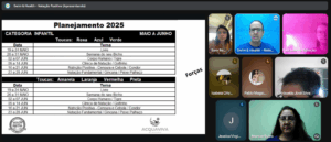 Marcos apresentou e reforçou com o time os objetivos técnicos da metodologia no tempo, a estrutura de aula padrão, a classificação dos alunos nas fases, o planejamento temático e os projetos Educação Positiva, Nutrição Positiva e Aula Corpo Humano.
