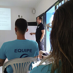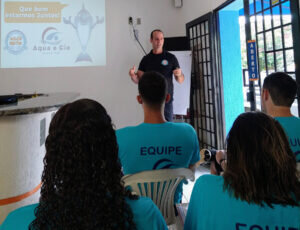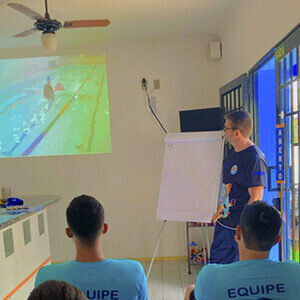 Na primeira parte do treinamento, Marcos Ruivo apresentou as ideias e os diferenciais que fazem o método ser referência na boa performance técnica na natação formativa e na educação positiva que está associada ao processo de ensino.