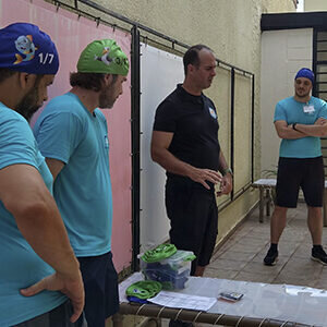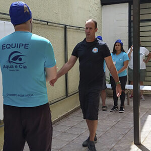 Adriano Rossi deu início ao treinamento apresentando o idealizador da metodologia Marcos Ruivo ao time e compartilhando sua experiência com a Swim & Health Natação Positiva. Agradecendo também a presença do time de professores da Aqua e Cia.