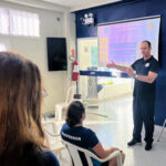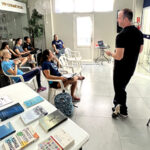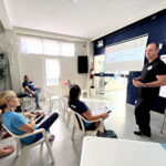 Marcos deu início ao treinamento de atualização com uma breve introdução teórica. Com o time reunido, Marcos reforçou a estrutura de aula, os modos de aprendizagem e abordou os principais pontos da semana de Natação Fundamental.
