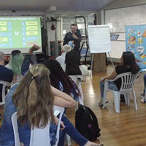 Rafael Zucco apresentou a nova estrutura de aula que possui uma sequência pedagógica de atividades prescritas e associadas aos 28 animais que compõem a representação das fases.