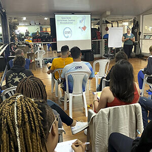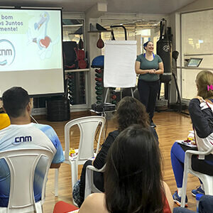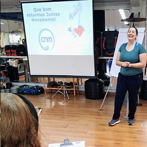 Jennifer Lourenço, gerente da CNM e Caroline Albacete, líder de departamento, marcaram presença junto aos times de professores e comercial. Jennifer iniciou o treinamento de atualização agradecendo a presença de todos.