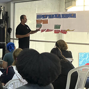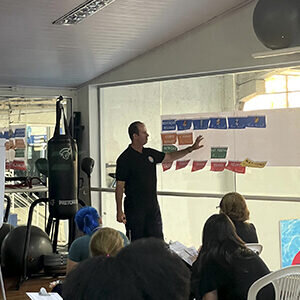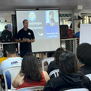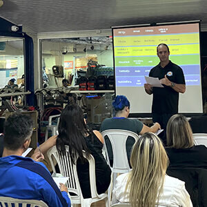 Marcos Ruivo deu continuidade apresentando a pauta do treinamento, entre elas o alinhamento da ideia de longo prazo, conceitos do reforço positivo x condicionamento clássico e estrutura de aula.