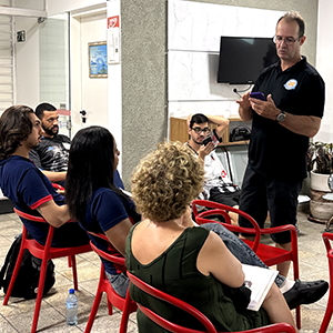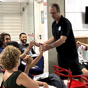 Ao longo do treinamento, Marcos esclareceu dúvidas e apresentou variações de atividades, exemplificando, de forma prática, diferentes abordagens e modos de aprendizagem para a equipe.