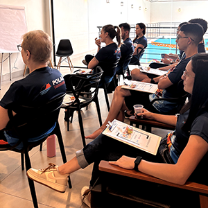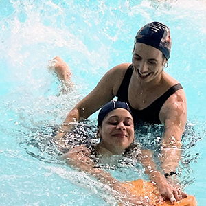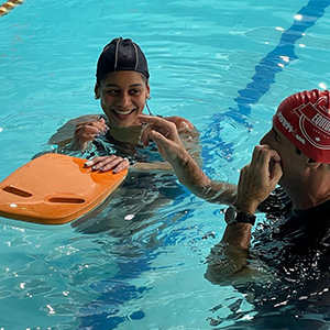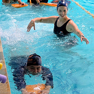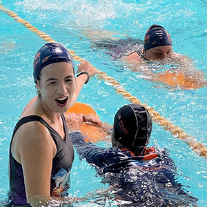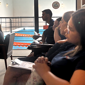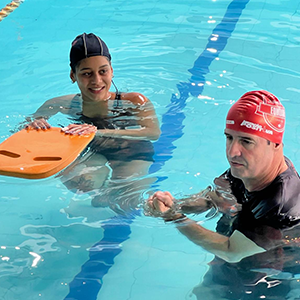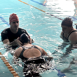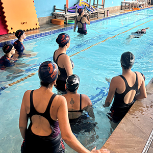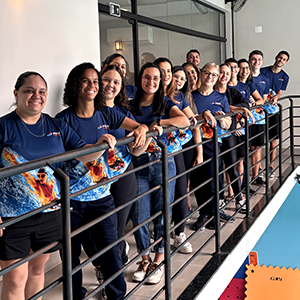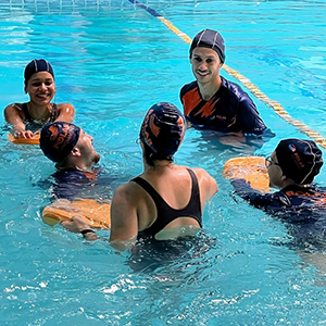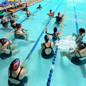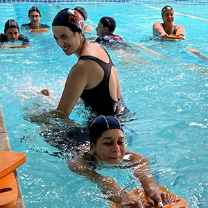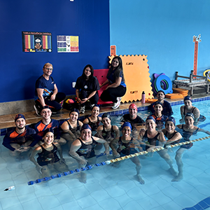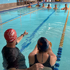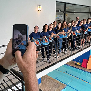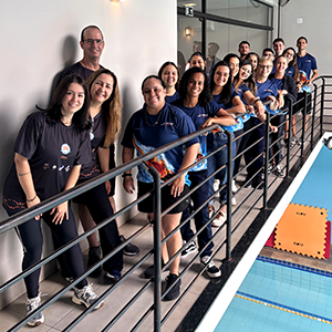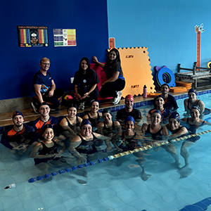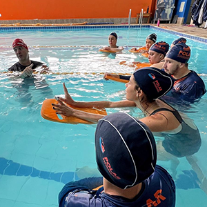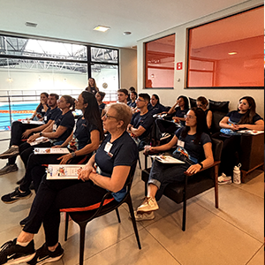 Na piscina, o time observou e simulou a estrutura de aula e seus blocos, vivenciando a dinâmica de aula e abordando diferentes níveis de aprendizado desde iniciantes até técnicas avançadas. No decorrer do treinamento, Marcos sanou as dúvidas e demonstrou algumas variações para exemplificar ao time os modos de aprendizagem.