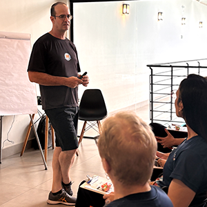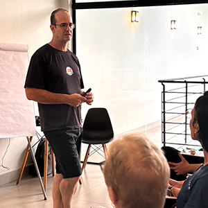 Na primeira parte, reunidos em sala, Marcos iniciou a parte teórica reforçando a estrutura, a dinâmica de aula, e os modos de aprendizagem. Aproveitou o encontro também para esclarecer as dúvidas e responder as perguntas que foram enviadas pelo time através do formulário, durante a semana do treinamento.